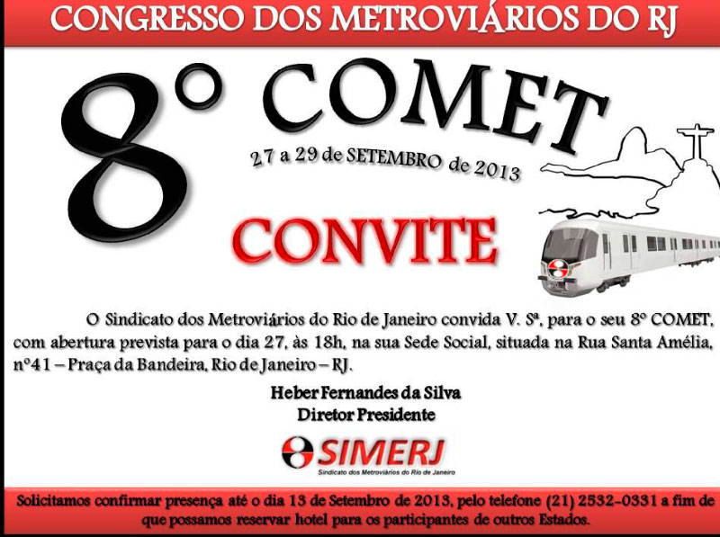 Regimento Eleitoral para eleição de Delegadas (os) para o 8º Congresso do Sindicato dos Metroviários do RJ. Dias 27, 28 e 29 de setembro 2013