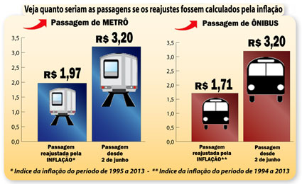 O governador Alckmin e o prefeito Haddad aumentaram as passagens. Desde ontem, as tarifas do metrô, trens e ônibus subiram para R$ 3,20. É um verdadeiro assalto aos nossos bolsos! O reajuste está muito acima da inflação acumulada. Em 1995, a passagem do metrô custava R$ 0,80. Se fosse corrigida pela inflação do período, teria de ser hoje de R$ 1,97. Os usuários do metrô estão sendo lesados em R$ 1,23!