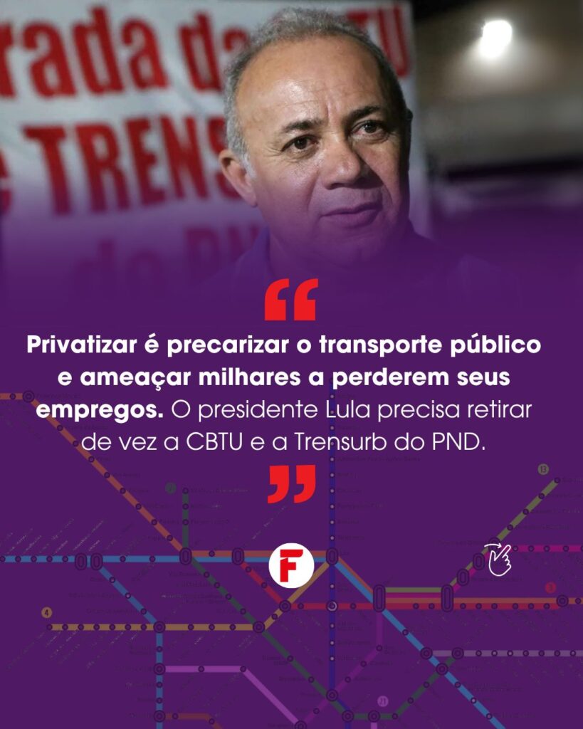08.10.25 Destaques, Notícias, Rio Grande do SulA Federação Nacional dos Metroviários e Metroviárias (Fenametro) reafirma seu total apoio à luta do Sindimetrô-RS contra a privatização da Trensurb e pela realização urgente de concurso público. Essa luta é parte de uma mobilização nacional que busca pressionar o governo Lula a recuar da privatização da Trensurb e da CBTU, garantindo que o transporte público permaneça sob controle estatal e a serviço da população.