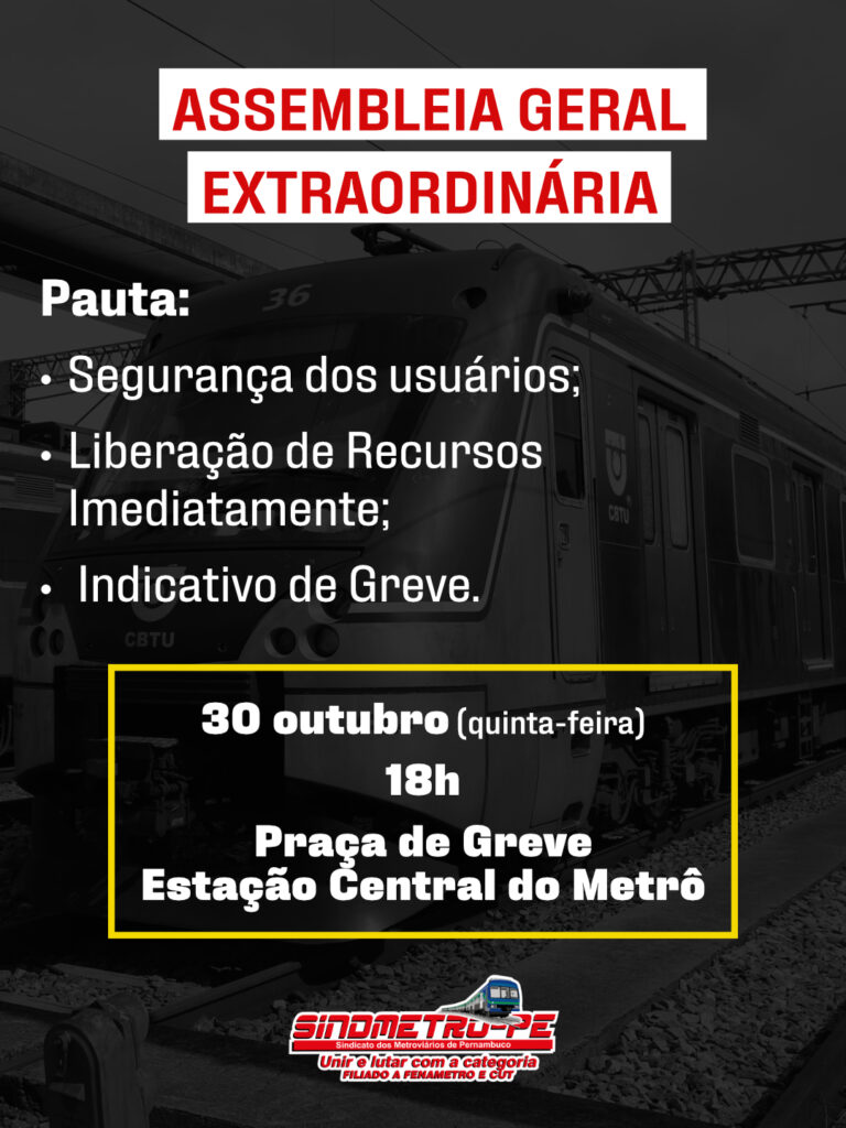 28.10.25 Destaques, Notícias, PernambucoO Sindmetro-PE está convocando a categoria metroviária e toda a população para uma Assembleia Geral Extraordinária nesta quinta (30), às 18h, na Praça de Greve da Estação Central do Metrô. Na pauta: segurança dos usuários, liberação imediata de recursos e indicativo de greve.