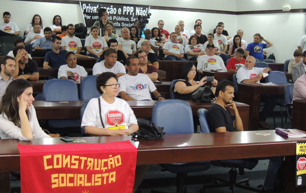 Atendendo solicitação do Sindimetrô/RS, a Comissão de Segurança e Serviços Públicos da Assembleia Legislativa do Rio Grande do Sul promoveu na segunda-feira, dia 14, uma audiência pública que discutiu a privatização da Trensurb. O encontro reuniu metroviários e representantes de outras categorias, como o Sindicaixa, Simpe, Sindppd, da central sindical CSP Conlutas e oposições do CPERS/Sindicato e Aeroviários. Também participaram representantes dos metroviários do Rio de Janeiro, São Paulo e da Fenametro. A Trensurb foi representada pelo seu diretor-presidente, Humberto Kasper.