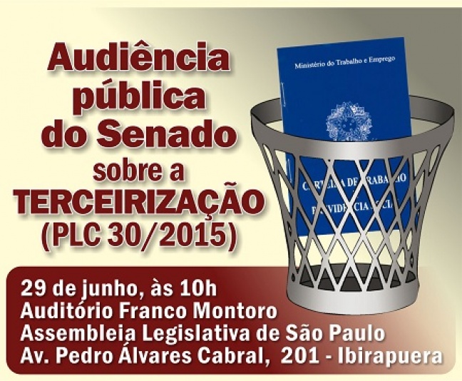 A Comissão de Direitos Humanos e Legislação Participativa do Senado (CDH) realizará audiência pública para debater o Projeto de Lei da Câmara (PLC) 30/2015, que libera a terceirização ilimitada, inclusive na atividade-fim, a principal de uma empresa. A audiência, que será presidida pelo senador Paulo Paim (PT-RS), será no próximo dia 29 de junho (segunda-feira), às 10h, no Auditório Franco Montoro da Assembleia Legislativa de São Paulo (Alesp), na Av. Pedro Álvares Cabral nº 201.